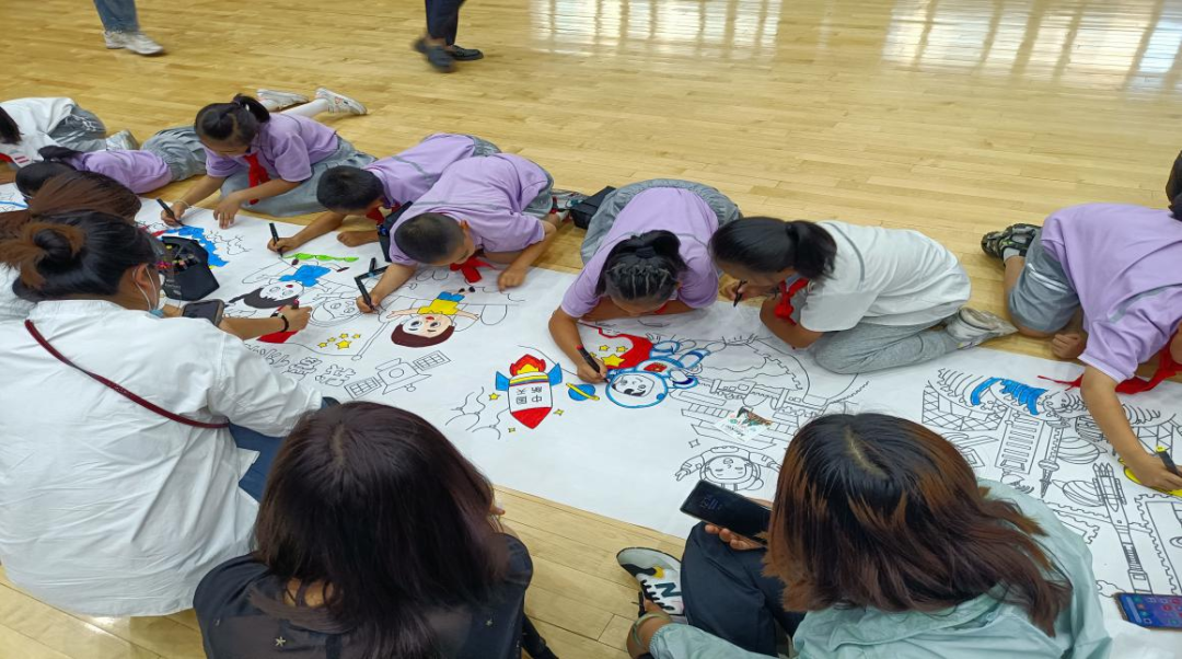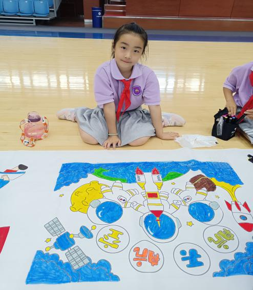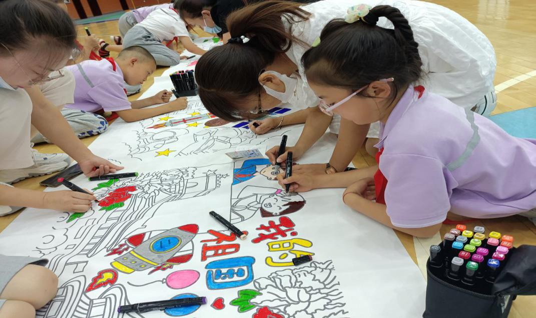 孩子们在老师的引导下展开丰富想象,以饱满的热情投入绘画与书法创作中。稚嫩的小手不停描绘,有的画出了高高飘扬的党旗,有画出了壮丽的河山,有的画出了蓬勃发展胡航天事业,还有的画出了茁壮快乐的成长,一幅幅色彩斑斓、充满童趣的作品,饱含着孩子们对党和祖国的颂扬、对生活的热爱以及对未来的憧憬。孩子们还现场讲述自己绘画的用意和对祖国的祝福。